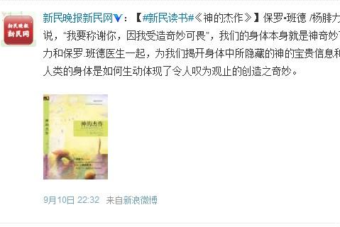 新民晚报新民网”在9月10日微活动“新民读书”中向读者分享了书籍《神的杰作》,从10月5日开始引起了一些基督徒的关注。2012年来,一些新闻媒体在其官方微博上分享经文或属灵书籍的情况还不止这一次。