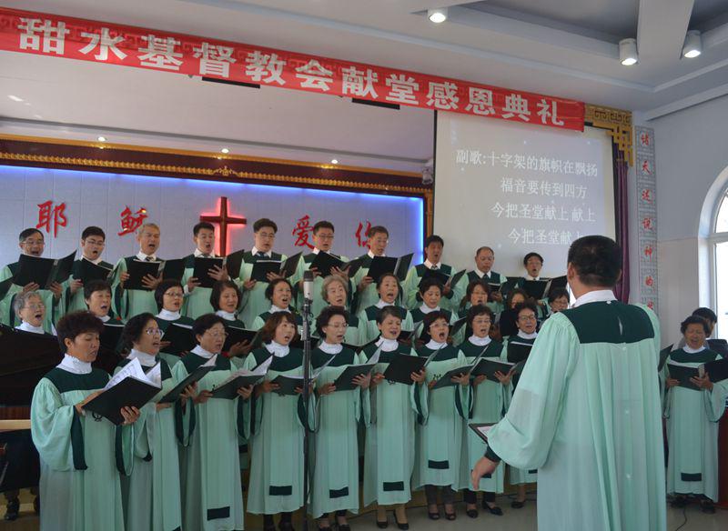 9点半钟,随着全体会众同唱《三一颂》的歌声,感恩崇拜正式开始。受邀前来参加崇拜的上海鸿德堂诗班献诗《今把圣堂献上》,辽宁省基督教协会会长沈光玮牧师引“列王记下4章1至7节”的经文证道,分享先知以利沙帮助穷寡妇卖油还债的事迹。沈牧师向甜水教会的肢体们表示祝贺,也勉励大家倒空自己,多多预备,祝福甜水教会所有的器皿都被充满,提醒众人不能忘记传扬福音。