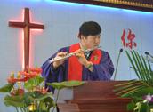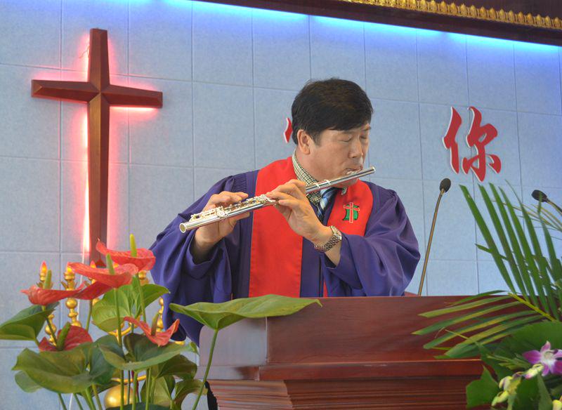 随后,主礼人朴桂峰牧师邀请大家参加一个互动,分段共同完成赞美诗374首《与主接近歌》的演唱——这首赞美诗共分为五段,第一段由琴师独奏,第二段由上海诗班献唱,第三段会众同唱,第四段朴牧师吹长笛,第五段再次会众同唱。