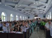 当天上午不到9点钟,赞美的歌声已不受崭新教堂的约束,远远的传到了附近的102国道上。甜水教会的弟兄姊妹们早就在教堂门口排成两队,以灿烂的笑容、“耶稣爱你”的问候,给前来参加献堂典礼的各地肢体们喜乐的脸上再添笑容。