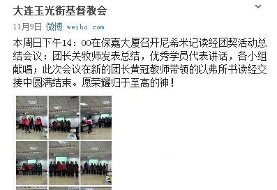11月9日(周日)下午两点,玉光街教会在保嘉大厦召开尼希米记读经团契活动总结会议,会上,团长关瑞娣牧师发表总结讲话,以及有优秀学员代表讲话,各小组献唱,最后还来一场“交接”——黄冠教师作为新团长接力带领以弗所书读经。
