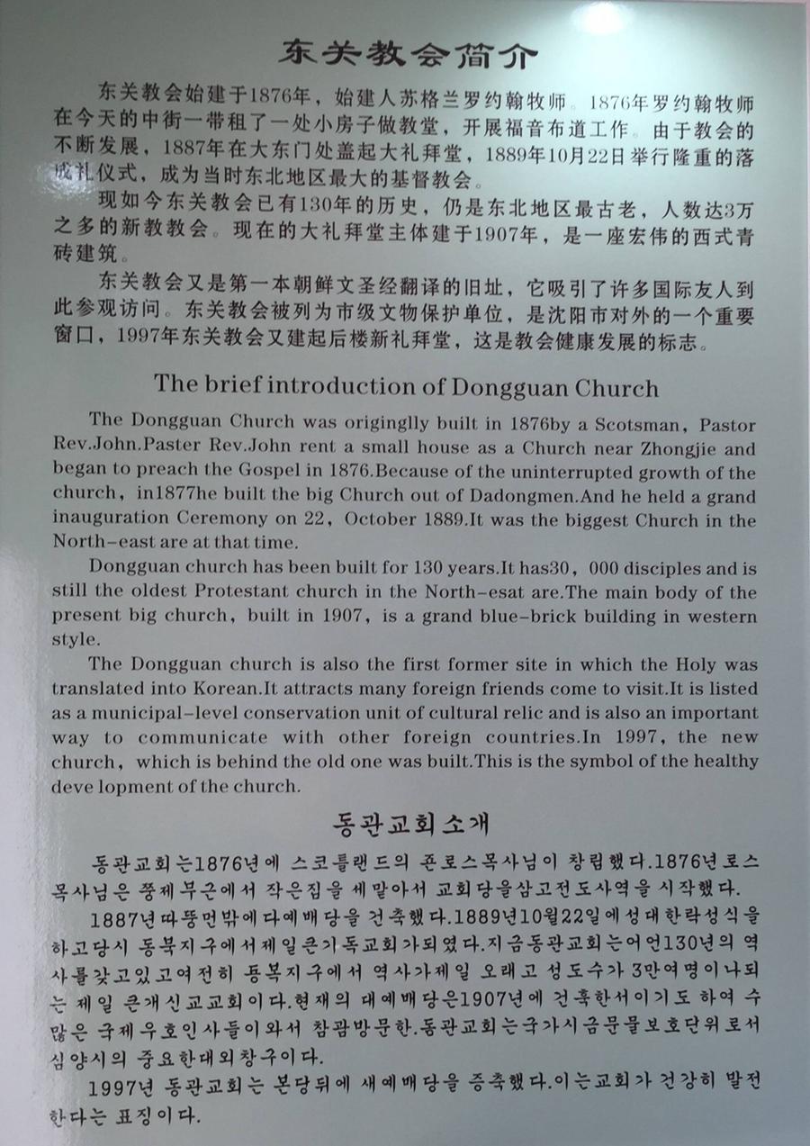 沈阳东关教会有一个独立的小房子,里面记录了东关教会的发展历史和现状,还有不同年代的圣经,这个屋子是第一本朝鲜族圣经的翻译地。