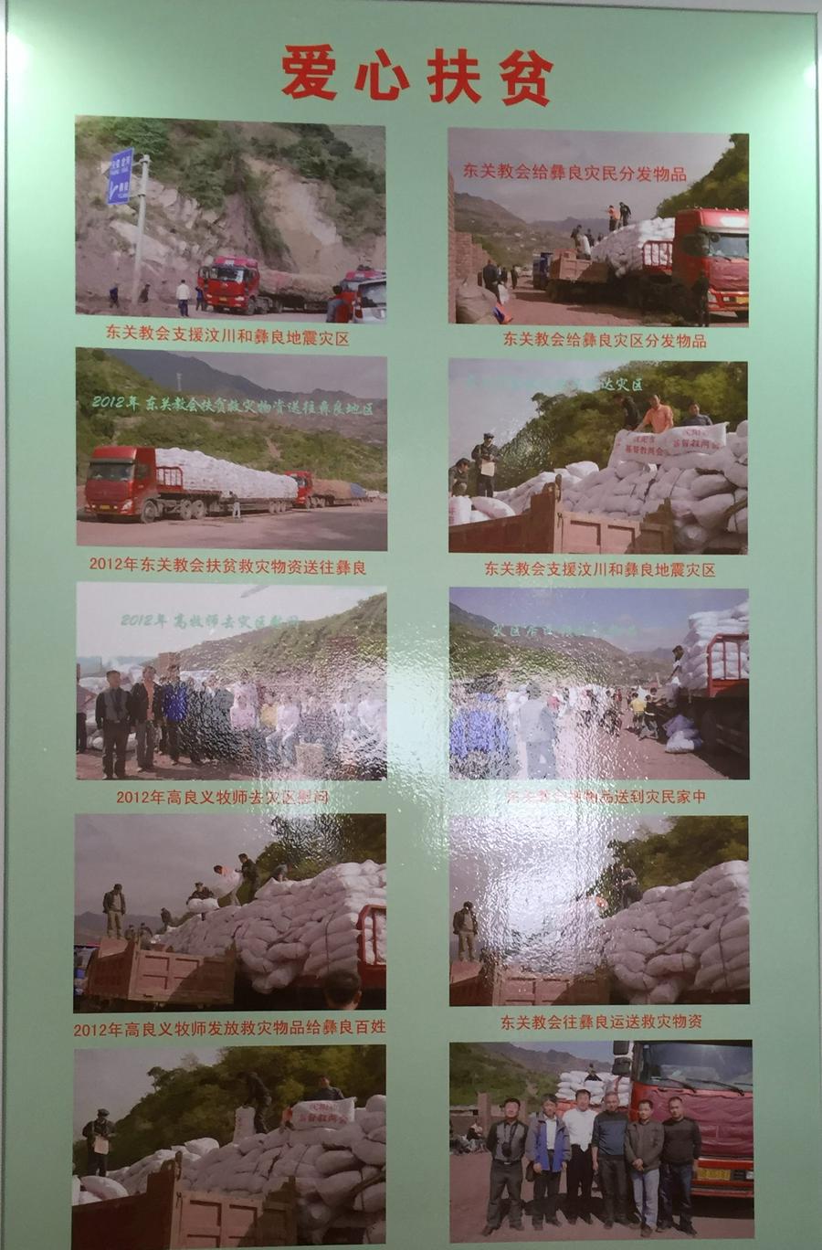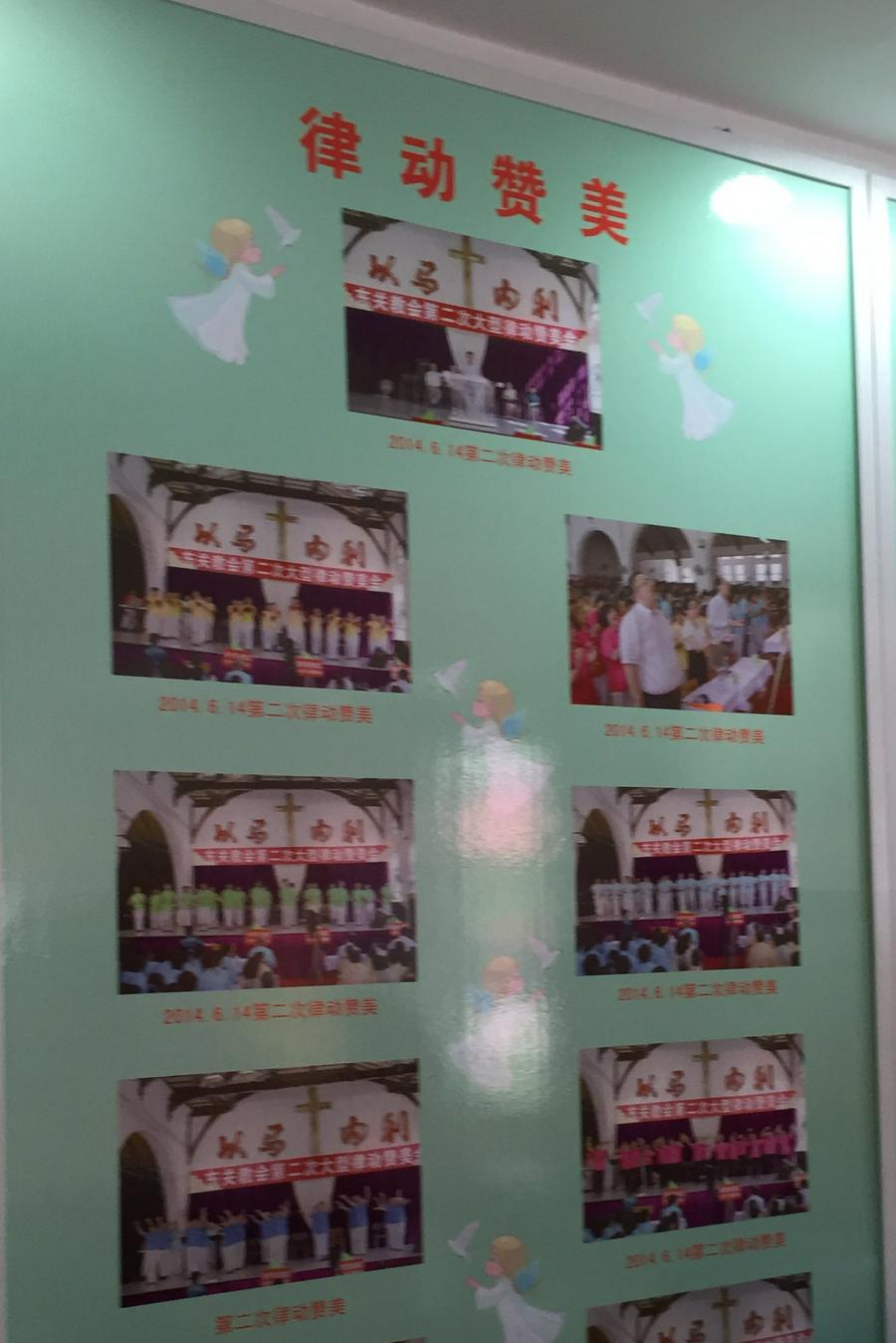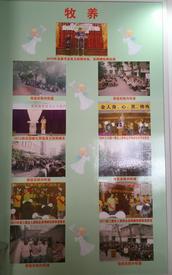 进入屋内,可看到屋子四面的墙上展示了教会的历史和现状。有东关教会创立的历史简介、有教会从创立至今的7届主任牧师照片、创立牧师罗约翰的简介以及教会现在开展的各项活动照片。