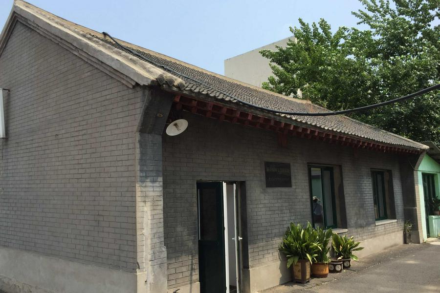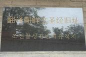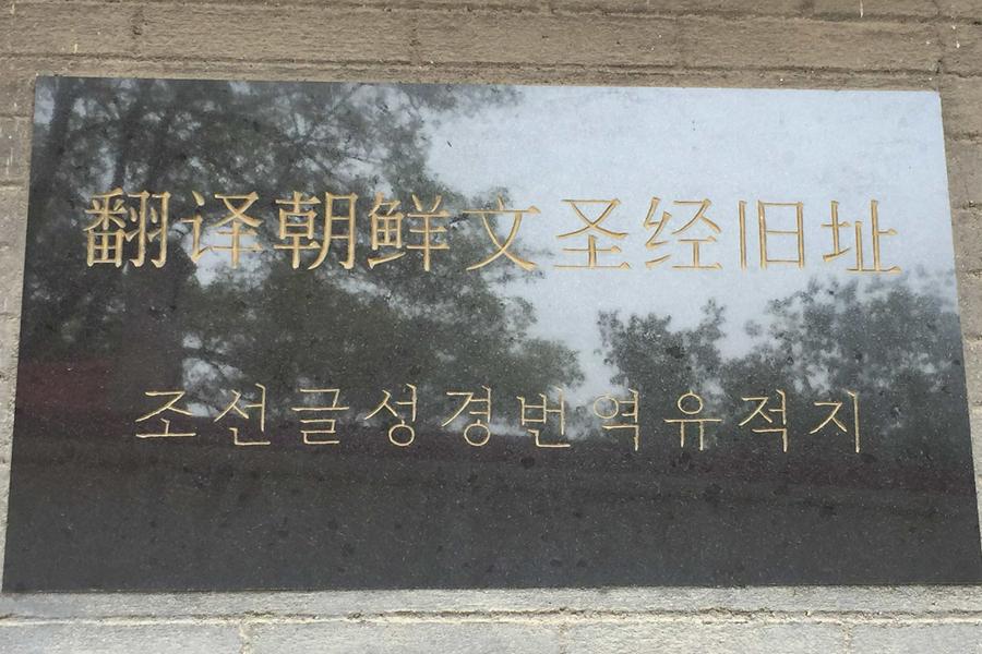 这间灰色的砖瓦小屋有一扇门和两扇窗,门旁边的墙壁上贴着一块石牌,石牌上写着“翻译朝鲜文圣经旧址”。