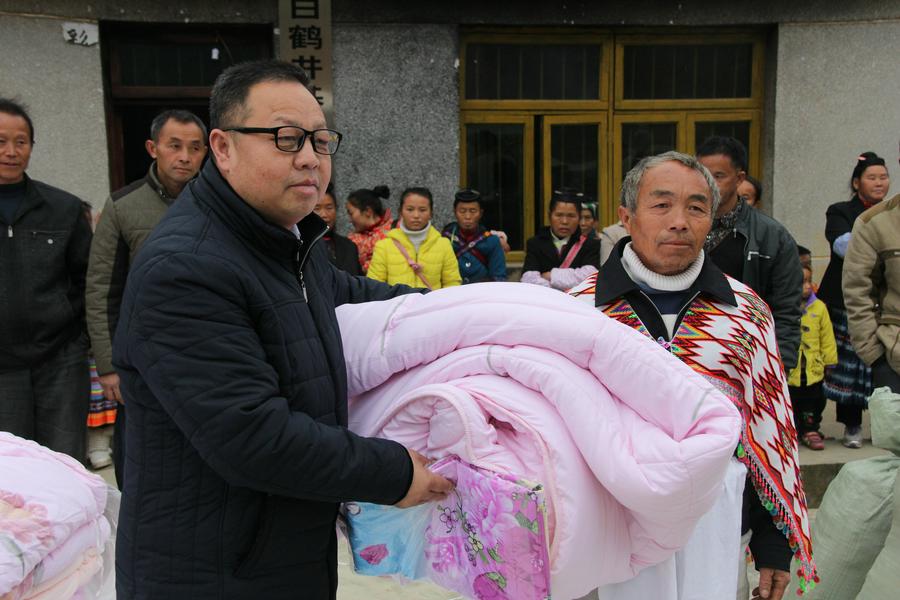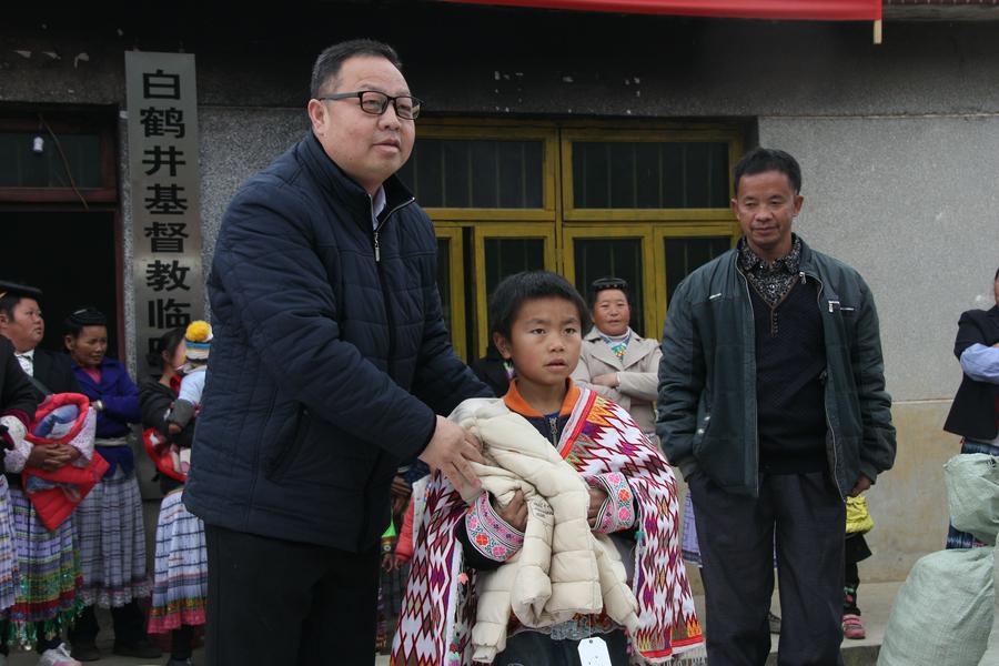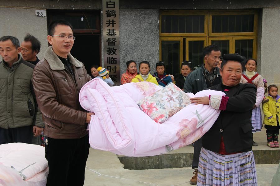 杨朝云牧师拿出一条棉被递到杨少华老人手中,老人双手接过棉被,激动得一句话也说不出来;贵阳市基督教协会副会长兼秘书长朱锡升牧师把一件粉红色的羽绒服递给身边的一位小女孩,她似乎不太相信眼前的一切,用审视的目光认真看了一下眼前的这位叔叔,这才展开笑脸一下子把衣服抱得紧紧的,然后迫不及待地转身躲到大人们的背后,脱掉身上的衣服,要一旁的大人给她穿上——小女孩叫马光婷,原来户口在六枝特区中寨乡四角坡苗寨,今年6月,在镇政府的帮助下,全家的户口已经迁到了广顺镇,现在在龙青幼儿园读书。