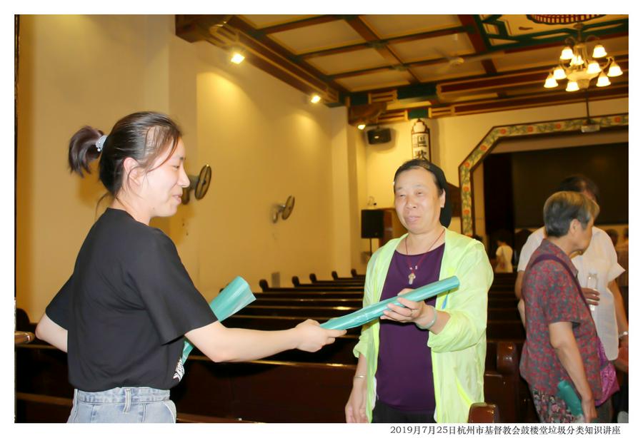 上城区清波街道胡晨霞老师则以“杭州市生活垃圾分类操作指南”为题,耐心详细地讲解了垃圾分类对环境保护的重要性,以及如何在生活中进行垃圾分类,与此同时还为弟兄姐妹带来了垃圾分类操作指南手册若干和生活垃圾袋作为礼物。