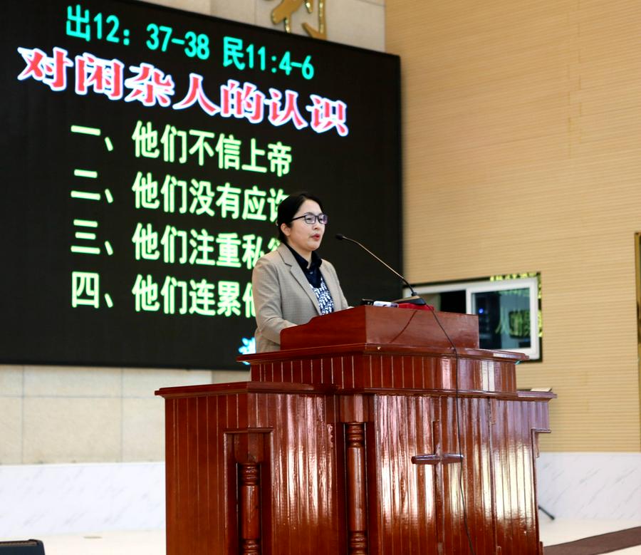 今天为主证道的是教会负责人徐玲长老。她带领弟兄姊妹恭读圣经出埃及记12章37至38节、民数记11章4至6节的经文,以《对闲杂人的认识》为题,从“他们不信”“他们没有应许”“他们注重私欲”“他们连累他人”四个方面与大家分享。徐长老在证道中理论联系实际,非常贴切的宣讲了“闲杂人”的特征和信徒们应警醒的地方,使人很受启发。