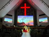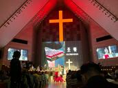 接下来是圣餐环节,领餐前,服侍同工会从台前的大十字架上取下一个个十字架项链戴在每位领餐者身上,教牧同工首先从主礼人领十字架、受圣餐,然后诗班同工和会众依次上台领十字架、受圣餐,在《十字架》的吟唱中,会众依次排队上前,整个过程庄严肃穆。