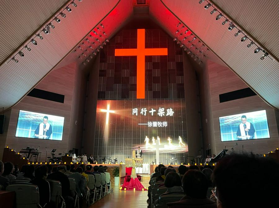 此次崇拜由单渭祥牧师主礼,徐蕾牧师证道。主礼人宣布崇拜开始,众立同颂《奇秒十架歌》,诗班献唱《看哪,神的羔羊》。诵读启应经文后,众颂《我信主耶稣歌》。