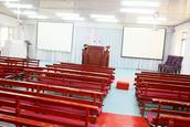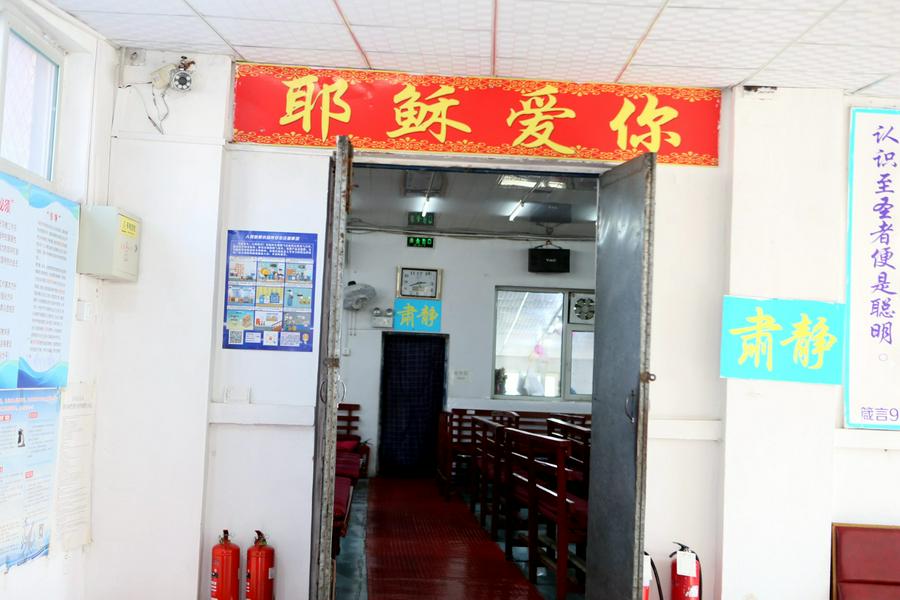 这是一栋由普通的、具有东北地方特色的“平房”组成的教堂,而且是屋中有屋、那种相连的教堂建筑。教堂门前五星红旗高扬,小南基督教会的红色屋顶上方是荣耀的十字架,“践行社会主义价值观”等“四进”在教堂明显的位置。在主堂外面“耶稣爱你”的红色祝福语映入眼帘,主堂大约可容纳百余人听道,影响、投影等设备俱全。我看到教会的各项规章制度健全,诗班、财务、后勤等各个班组分工明确,说是“小”,其实符合圣经真理的教会组织和体系一点也不小,彰显神的荣耀。