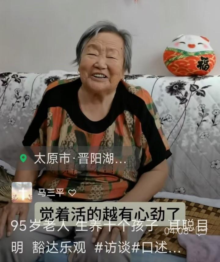 答:“我从年轻到老,都是粗茶淡饭。也没有吃好的、喝好的。我这人实际上就是心宽、心大,不计较人,人对咱不好,咱也能忘了。不记仇,觉得什么地方也没有生气的事,心里老是痛快的。活的恓惶(可怜)也不埋怨,这辈子和你爸没有因为钱生过气,是曾经因为话不投机生气打架哩,不是嫌他穷,嫌他没吃的,嫌他照顾我不好,不是因为这些生过气,从来没有因为穷生过气。在家里和娃家也没生过气,这会儿骂上一顿,过上一会儿就忘了。在家里再穷再不好活,没有和别人说过。我这人心大,也不装富,也不装穷,俺也不说恓惶地活不成。即使真正搭不上锅也不和人说,前半辈子恓惶多哩,从来不给人说过。”(儿子的话外音:老太太生养了十个孩子,我是他的第九个孩子。老太太一辈子不容易,但是她能健康活到九十五岁,真的很不容易,你看她的心态多好。她的长寿秘诀,就是粗茶淡饭天天吃,心大心宽不记仇,活的恓惶不埋怨,不装富,不装穷。)