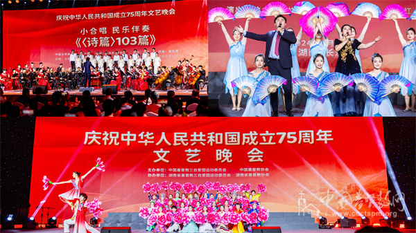 23日晚,庆祝中华人民共和国成立75周年文艺晚会在长沙腾辉堂举行。来自各地教会、神学院校的弟兄姊妹,以舞蹈、音乐、朗诵等形式,表达中国基督徒对祖国的深切感情和美好祝愿。其中多个作品采用中国传统曲调、融合中国民族舞蹈、通过中国化表演形式,带来了耳目一新的视听感受,展示了圣乐中国化事工的成果,也展现出中华儿女扎根中华大地的文化自信。