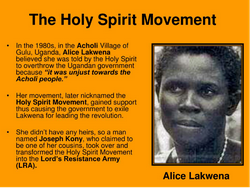 27岁那年,爱丽丝自称获得获得“圣灵”的启示,并被长期在非洲侍奉的意大利修女拉卡维娜附体(这位修女在当地颇有威望,被当然人视为圣灵化身),拥有掌握上主话语的能力。这套言辞在我们看来非常荒谬,可在信仰异端、科学落后、社会动荡、贫穷落后的乌干达却颇有市场,就这样这个女魔头建立了“圣灵运动”这一邪教组织。