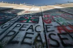 2022年11月23日,巴勒斯坦伯利恒:在将伯利恒与耶路撒冷隔开的一段墙上,有涂鸦写着“愿和平”