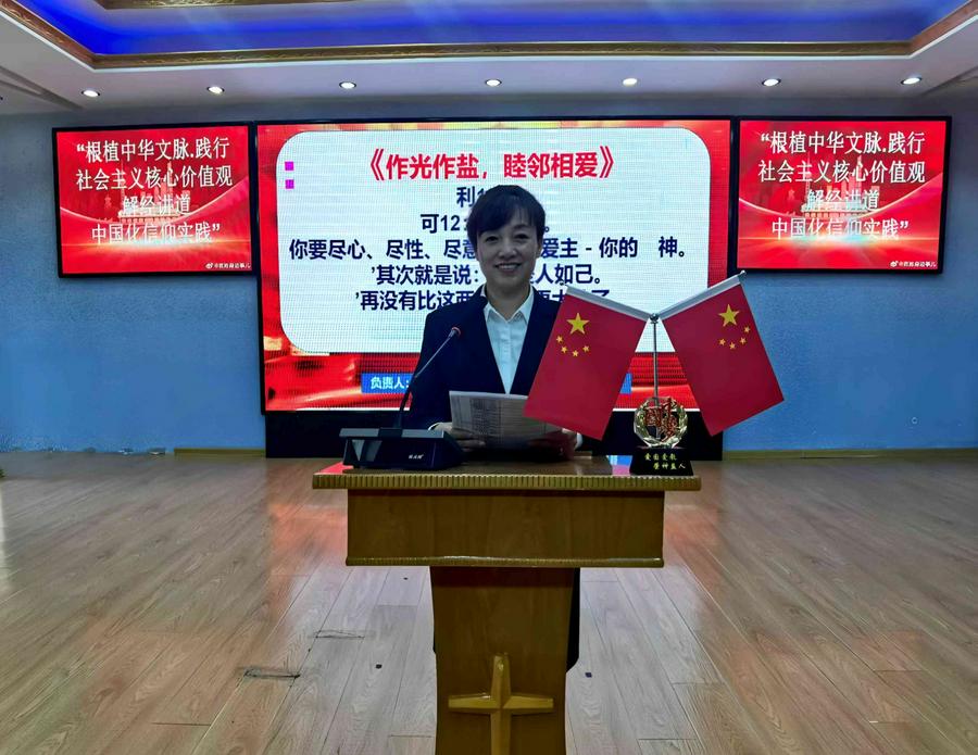 在红红火火的圣殿中,陶艳萍教师、冯爽教师,以“根植中华文脉、践行社会主义核心价值,观解经讲道,中国化信仰实践”为主题,分别宣讲了《做光做盐、睦邻相爱》、《宗教与爱国同频、信仰与时代共振》。她们从“爱人如己”的信仰教导出发,阐释“爱国爱教”、“荣神益人”的深刻内涵,指出基督教中国化并非简单的形式调整,而是要将信仰与国家发展、民族复兴紧密结合,在践行公民责任中彰显信仰价值。今日我们庆祝新中国华诞,既是感恩国家为我们创造了和平稳定的信仰环境,更应思考如何以信仰之力服务社会、贡献国家。弟兄姊妹要将信仰追求转化为爱国奉献的实际行动,在日常生活中践行社会主义核心价值观,让信仰在与时代同频共振中焕发新的生命力。