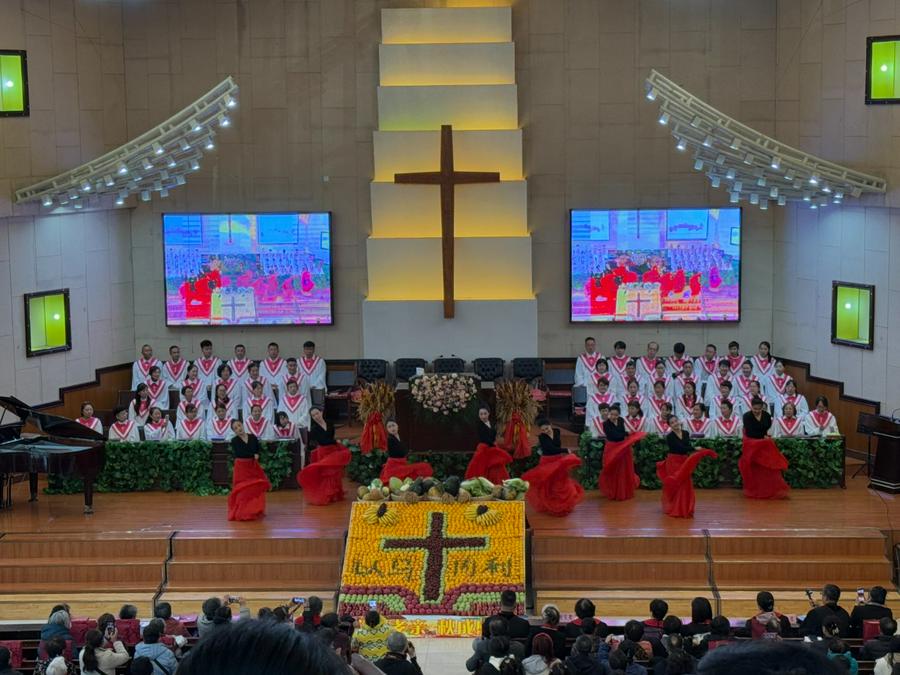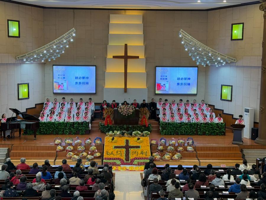 崇拜在与会众同声献唱的《圣哉三一歌》中拉开帷幕,诗班献唱《丰收谢恩歌》。随后,杨牧师围绕哥林多前书15章10节、帖撒罗尼迦后书2章13节、以弗所书6章1-3节、马可福音16章16节经文,从感恩、孝道、洗礼三个方面进行分享。