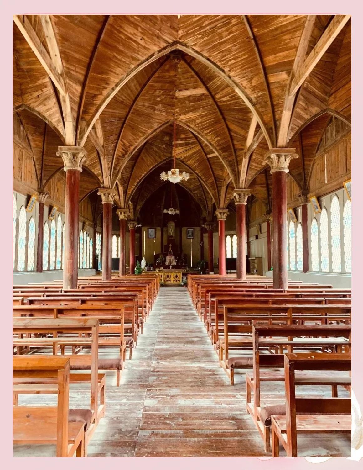 这座教堂在1912年重新翻建,形成了现在的规模,其外观呈现川西民居四合院布局,内部礼堂采用哥特式尖肋拱顶,门廊由10根立柱支撑,可容纳500余人。根据记载,教堂以“夯土墙体混搭青砖立柱,内部穹顶绘有圣经故事壁画,彩色玻璃在阳光下投射出斑斓光影,而屋檐下的雕花雀替、窗棂上的吉祥纹样,又处处透着中式建筑的温婉。这种中西合璧的设计,既尊重了当地的建筑传统,又保留了宗教建筑的庄严,成为当时文化交融的生动注脚。”